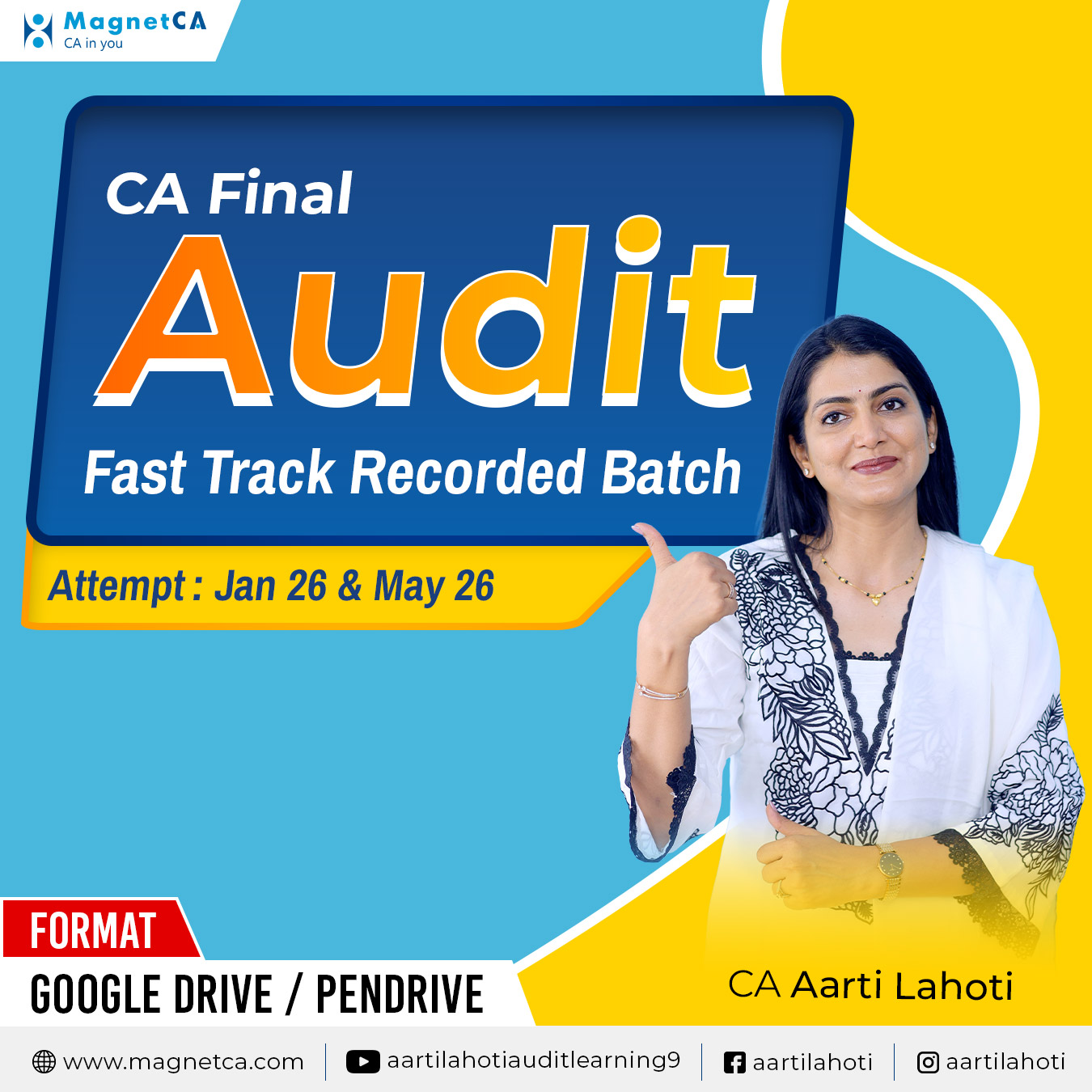 β‘ CA Final Audit Fast Track Recorded Batch Ace your CA Final Advanced Auditing, Assurance, and Professional Ethics preparation with this Fast Track Recorded Batch, specially designed for students targeting the Sept 2025 & Jan 2026 attempts. With focused coverage, expert guidance, and high-quality study material, this batch ensures you revise, practice, and master the entire syllabus effectively. π Key Highlights βοΈ Recording Period: Commenced in January; all lectures available by 10th February βοΈ Total Duration: ~74 Hours βοΈ Views: 1.5 Views & 3 Views (as per chosen plan) βοΈ Validity: 6 Months & 1 Year (options available) βοΈ Language: English βοΈ Attempt Coverage: Sept β25 & Jan β26 βοΈ Mode: Google Drive / Pendrive π Study Material Included π Advanced Auditing, Assurance, and Professional Ethics β Modules I & II (3rd Edition, Color Printed) π Authored by CA Aarti N. Lahoti β detailed, exam-focused, and updated with latest amendments. π₯ What Youβll Learn in This Batch π Comprehensive Lesson Plans covering the entire syllabus π Practice MCQs to evaluate your knowledge & identify improvement areas π Smart Revision Strategy for effective exam preparation π Expert Guidance & Mentorship throughout your learning journey π©βπ« Mentor CA Aarti Lahoti β One of Indiaβs leading Audit faculties, known for her simplified teaching, conceptual clarity, and exam-oriented approach. π Perfect for students looking for smart, time-efficient, and exam-focused preparation for Sept β25 & Jan β26 attempts.